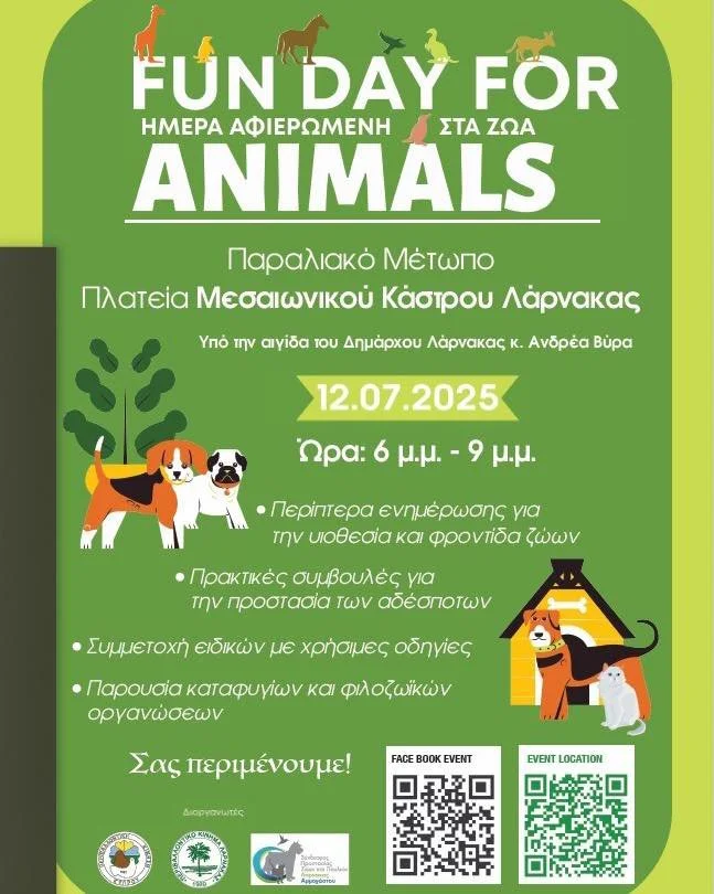 H Περιβαλλοντική Κίνηση Κύπρου, το Περιβαλλοντικό Κίνημα Λάρνακας και ο Σύνδεσμος Προστασίας Ζώων και Πουλιών Λάρνακας – Αμμοχώστου, διοργανώνουν εκδήλωση αφιερωμένη στην ευημερία και την προστασία των ζώων, υπό τον τίτλο: «Fun Day for animals» - «Ημέρα Αφιερωμένη στα Ζώα»